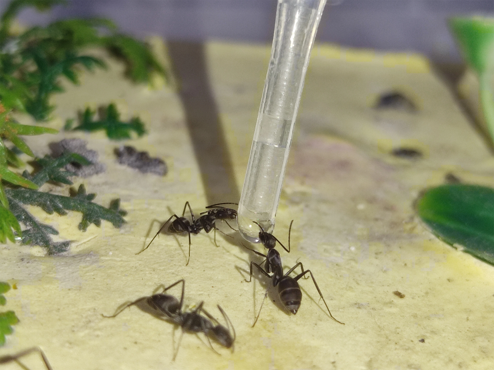 Để bổ sung protein giúp kiến chúa sinh sản tốt, anh cho chúng ăn thêm côn trùng và mật ong.