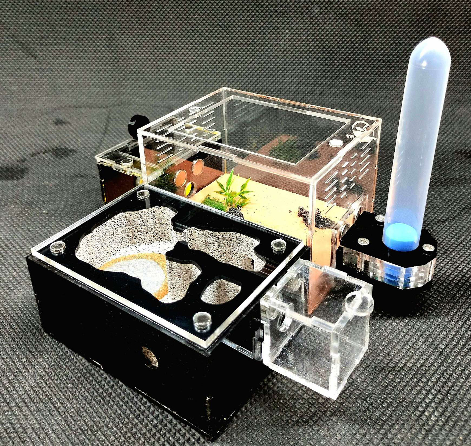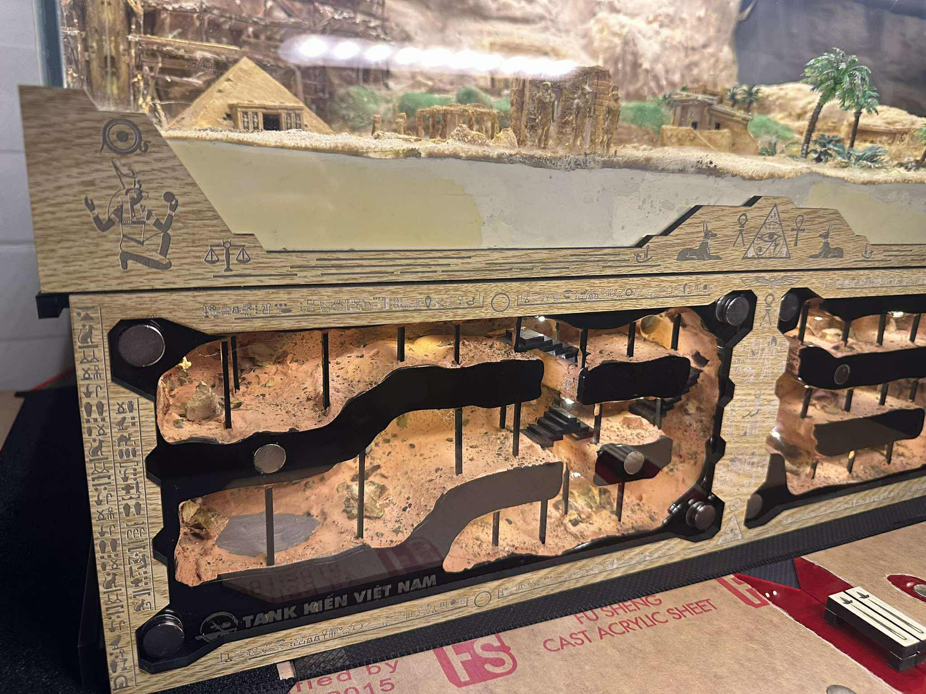 Một chuồng nuôi kiến thường bao gồm 2 phần chính: Phần tổ bên dưới làm từ một loại xi măng xây dựng và phần mô phỏng không gian săn mồi của kiến được bao bọc bởi các lớp mica trong suốt.